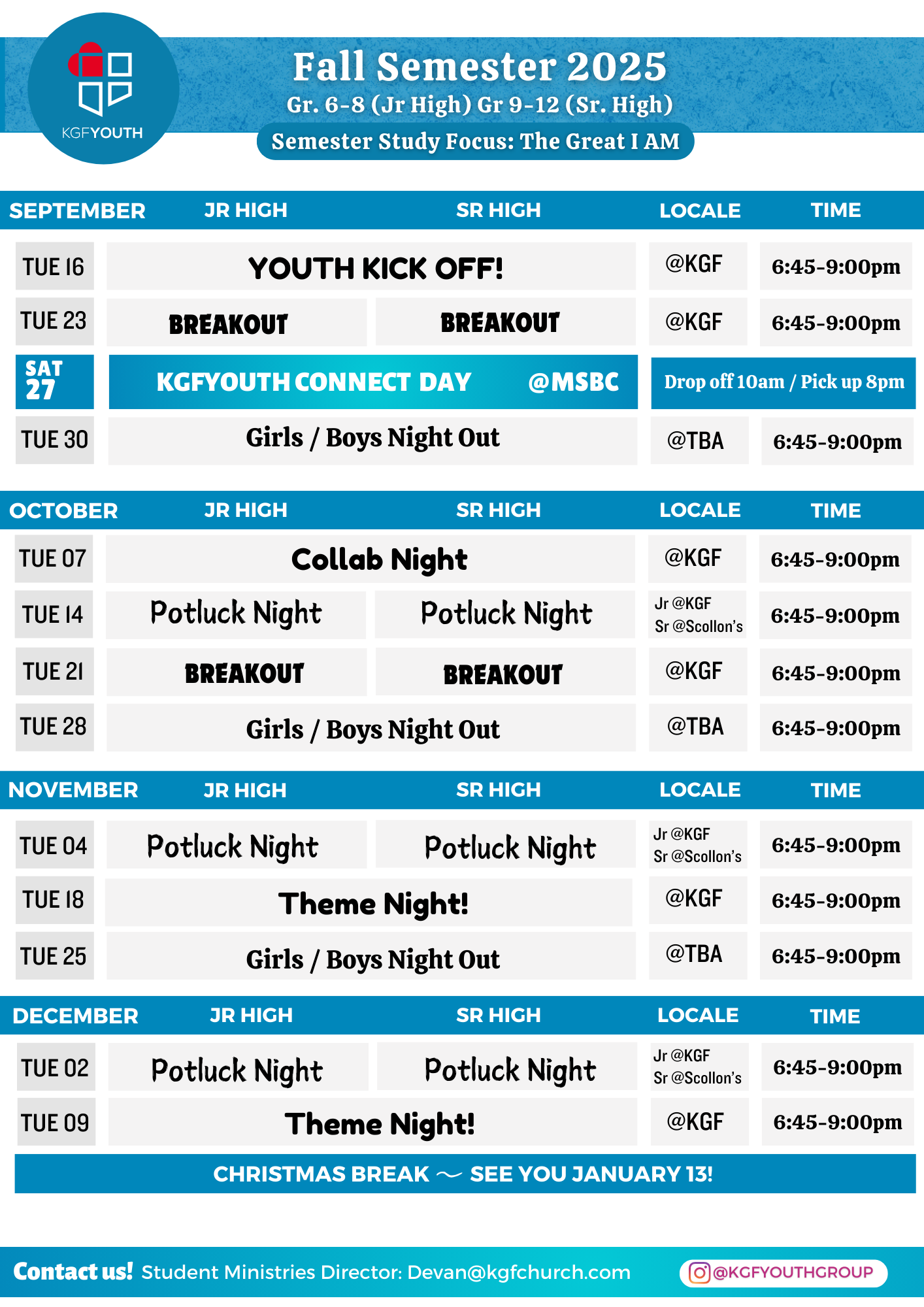 - Communication: Weekly emails include lesson themes, event updates, and plans for each night. Email me to get on the newsletter: devan@kgfchurch.com.